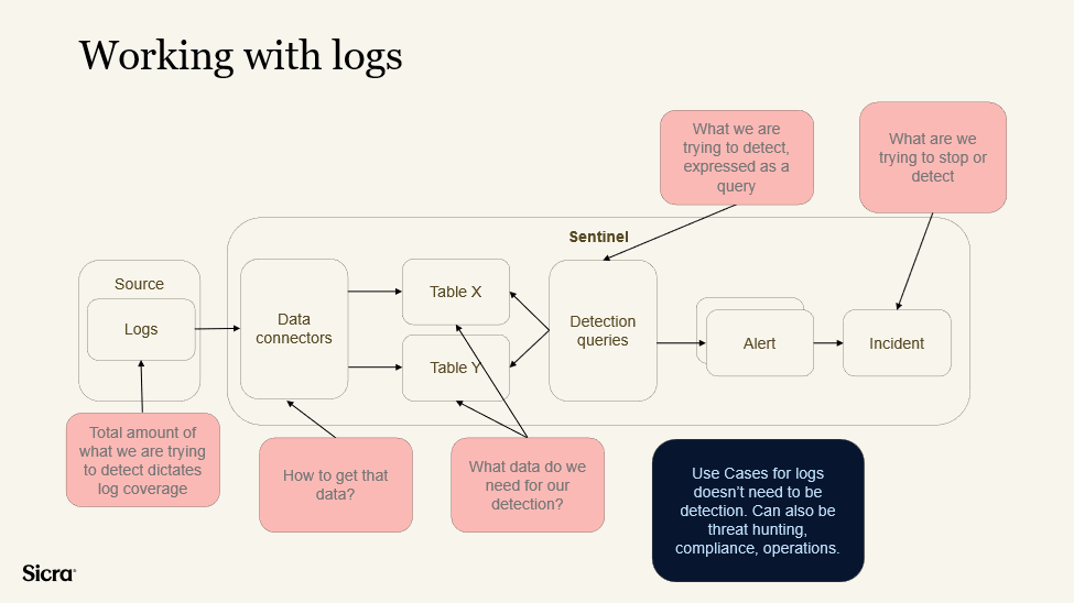 We need to start with identifying what we are trying to detect or stop from happening. In the graph above you can see a normal flow from the data source all the way to an incident. The idea is to think about what these incidents should be, based on what we are trying to protect, and then reverse engineer that into a query.
